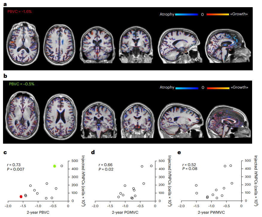 三個(gè)月后,每位患者又進(jìn)行了一次腰椎穿刺,研究團(tuán)隊(duì)發(fā)現(xiàn),他們的脊髓液中的神經(jīng)保護(hù)和抗炎分子都有所增加。每位患者在注射胚胎干細(xì)胞治療兩年后還接受了核磁共振掃描,那些注射最多胚胎干細(xì)胞的患者大腦灰質(zhì)損失最少。