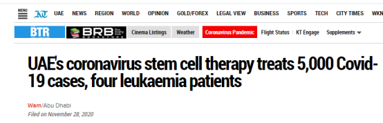 阿聯酉干細胞中心的數據顯示,他們開發的干細胞療法(UAECell19)已經幫助5000名患者從新冠病毒感染中恢復。經過試驗,研究人員得出結論,與接受標準治療的患者相比,干細胞療法(UAECell19)能將住院時間從22天縮短到6天。進一步的分析顯示,接受干細胞治療的患者比接受標準治療的患者在7天內恢復的可能性高3.1倍,接受干細胞治療的患者中,有67%的患者將他們的恢復歸功于新療法。