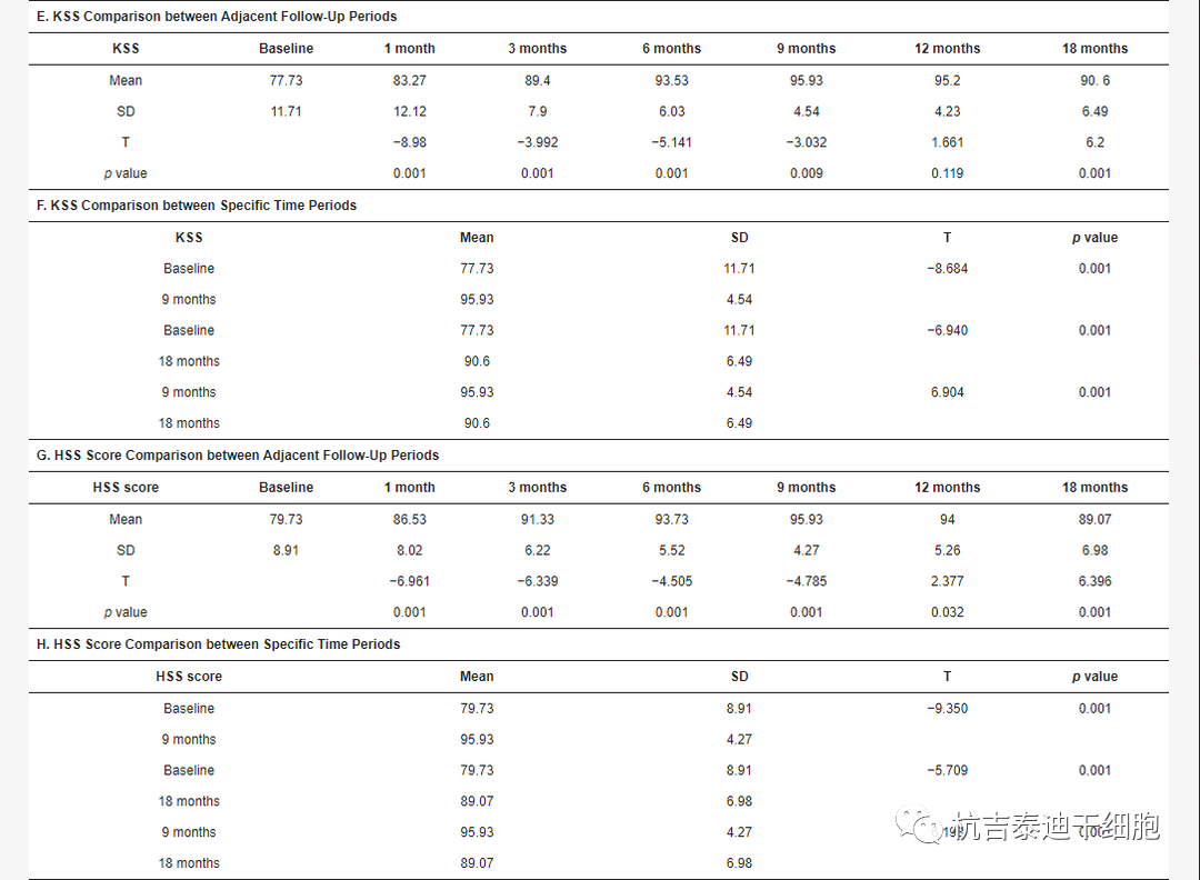 KSS和HSS分數:經過18個月的隨訪,患者的KSS從77.73±11.71提高到90.6±6.49,HSS評分從79.73±8.91提高到89.07±6.98。注射前和注射后18個月的評分之間存在顯著差異(p<0.05,如表2?(E–H) 和圖3所示)。