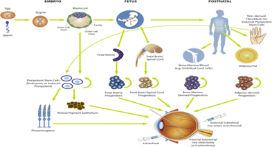 干細(xì)胞的想法是,通過(guò)將細(xì)胞重新引入眼睛,我們將能夠恢復(fù)由退行性視網(wǎng)膜疾病引起的視力[2]。干細(xì)胞可以作為身體的修復(fù)系統(tǒng),從一個(gè)未分化的細(xì)胞開(kāi)始,然后發(fā)展成一個(gè)特定的細(xì)胞 [3]。雖然干細(xì)胞是一種未分化細(xì)胞,但它們可以經(jīng)歷增殖,然后受到細(xì)胞因子刺激,成為一種特殊的特化細(xì)胞 [4]。有幾種類型的干細(xì)胞用于治療視網(wǎng)膜退行性疾病:視網(wǎng)膜祖細(xì)胞 (RPC)、胚胎干細(xì)胞 (ESC)、誘導(dǎo)多能干細(xì)胞 (iPS)、間充質(zhì)干細(xì)胞 (MSC) 和骨髓來(lái)源的VSEL。RPCs起源于胎兒或新生兒視網(wǎng)膜,并在胚胎發(fā)育過(guò)程中產(chǎn)生所有的視網(wǎng)膜細(xì)胞。(圖 1)顯示了干細(xì)胞的來(lái)源以及它們?nèi)绾伪惠斔偷揭暰W(wǎng)膜。
