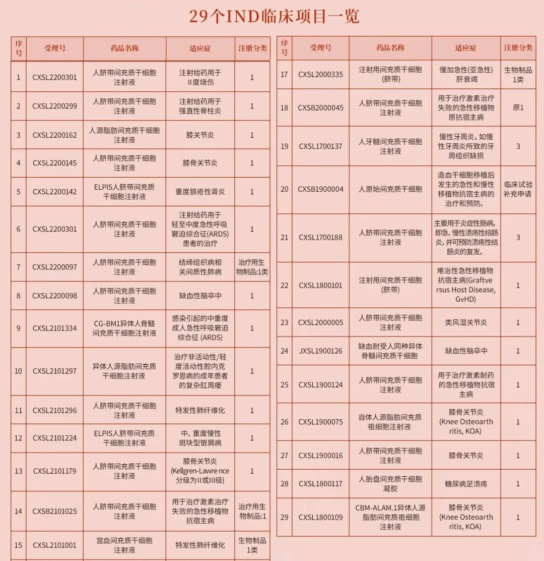 然而,在干細胞臨床應用方面根據國家藥品監督管理局藥品審評中心公示信息顯示,截止2022年10月31日,共有29個干細胞新藥項目獲得國家臨床默示許可。分別是胎盤、臍帶、牙髓、宮血、異體/自體脂肪來源的間充質干細胞,適應癥包括膝骨關節炎、類風濕關節炎、糖尿病足潰瘍、銀屑病、肺纖維化、肝衰竭、卒中、急性呼吸窘迫綜合征、牙周炎、克羅恩病和 GvHD。