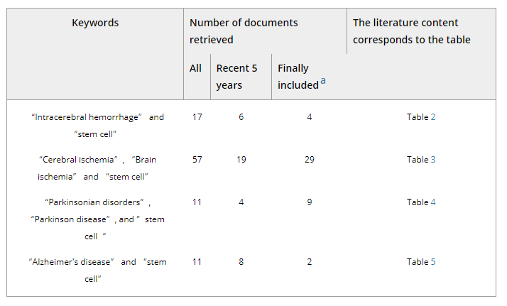 干細(xì)胞治療腦出血(ICH):ICH中與干細(xì)胞治療相關(guān)的有效文章有4篇。從手稿中提取了臨床試驗(yàn)的階段、細(xì)胞干預(yù)、劑量、輸注部位、試驗(yàn)數(shù)量(對(duì)照數(shù)量)、主要結(jié)果、安全性和年份(表2 )。