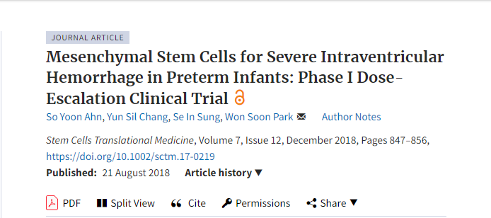 So Yoon Ahn用低劑量腦室內(nèi)移植MSCs治療了三名患有嚴(yán)重腦室內(nèi)出血 (IVH) 的早產(chǎn)兒和用高劑量MSCs治療了六名嬰兒。結(jié)果表明,移植耐受性良好,移植后腦脊液(IL)-6水平升高。初始CSF IL-6和腫瘤壞死因子-α水平與基線心室指數(shù)顯著相關(guān)。在這項(xiàng)研究中,沒(méi)有嬰兒死亡或出現(xiàn)與干細(xì)胞移植相關(guān)的嚴(yán)重不良反應(yīng)。嚴(yán)重腦室內(nèi)出血的早產(chǎn)兒腦室內(nèi)移植間充質(zhì)干細(xì)胞可能是安全可行的,值得進(jìn)一步的II期研究。