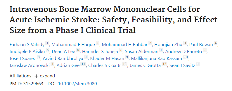 在一項(xiàng)單臂I期臨床試驗(yàn)中,在發(fā)病后24-72小時(shí)內(nèi)對(duì)中度急性缺血性卒中患者進(jìn)行骨髓采集和靜脈輸注自體BMMNCs(1000萬(wàn)個(gè)細(xì)胞/千克),接受治療的患者表現(xiàn)出1個(gè)百分點(diǎn)的降低第90天在mRS中的 ES,結(jié)果安全。