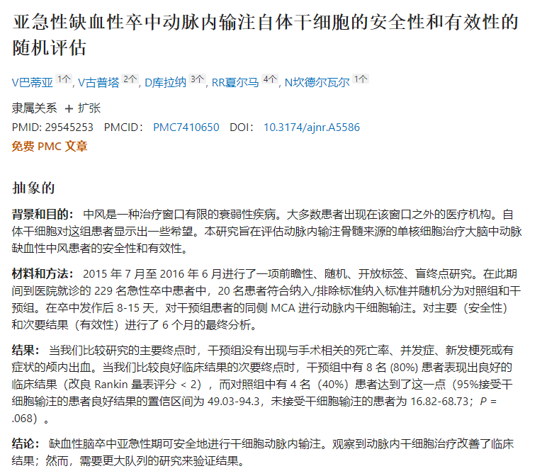 VBhati對(duì)干預(yù)組中風(fēng)發(fā)作后8-15天的10名急性中風(fēng)患者進(jìn)行同側(cè)MCA動(dòng)脈干細(xì)胞輸注,而對(duì)照組不進(jìn)行輸注。結(jié)果發(fā)現(xiàn),干預(yù)組中有 8名患者表現(xiàn)出良好的臨床結(jié)果,改良Rankin量表評(píng)分小于2,而對(duì)照組中有4名患者達(dá)到了這一結(jié)果。