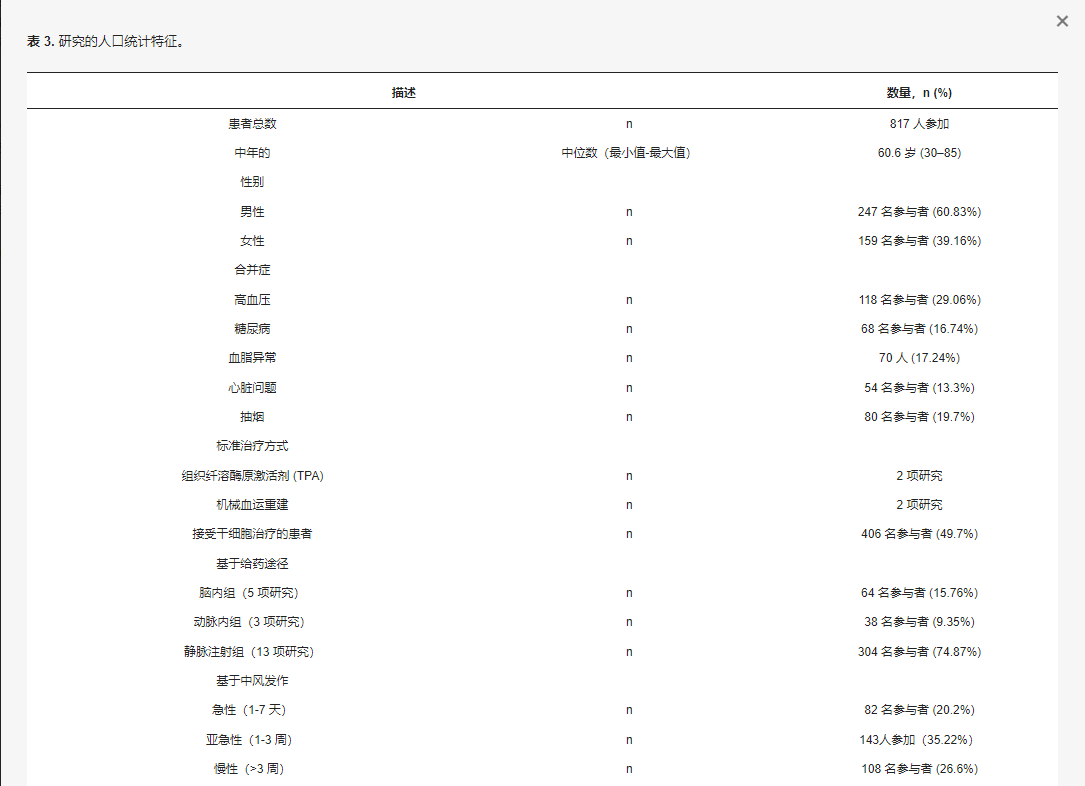 在21項研究中,共納入836名患者,中位年齡為60.6歲(范圍30-85 歲)。干細胞治療組由406名患者組成;247名 (60.83%) 參與者為男性,159名 (39.16%) 參與者為女性。