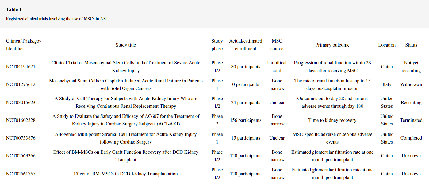目前,迫切需要對(duì)不同類型的AKI患者進(jìn)行額外的大型臨床試驗(yàn),以闡明MSC治療在AKI背景下的作用。已經(jīng)進(jìn)行了幾項(xiàng)正在進(jìn)行的試驗(yàn)來解決這些問題,表1列出了ClinicalTrials.gov上關(guān)于AKI患者的MSC治療的所有注冊(cè)試驗(yàn)。