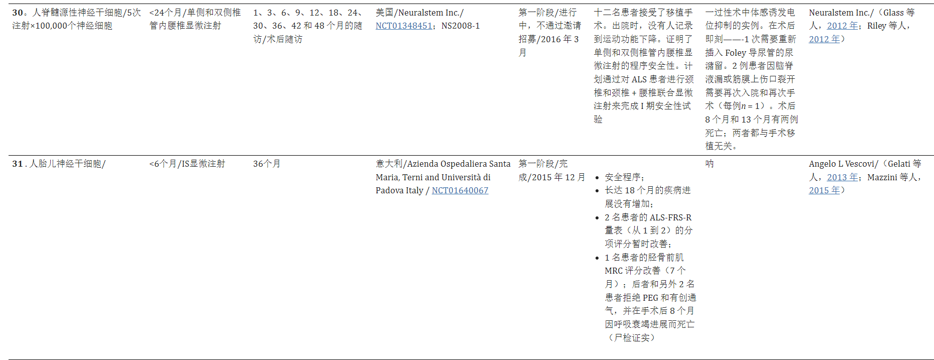 一項最新的前瞻性、非隨機、開放標簽臨床試驗已于2016年在捷克共和國布拉格完成。研究評估了自體多能MSC在確診為ALS的患者中的安全性和有效性 (?http://www.sukl.eu).?該試驗涉及26名散發(fā)性ALS患者,他們接受單次鞘內(nèi)(通過腰椎穿刺)劑量的自體MSCs,通過腰椎穿刺進入腦脊液。與之前的試驗相比,這項研究包括了最大的ALS患者群體,治療前后的評估期更長,并且使用了相對小劑量的干細胞。