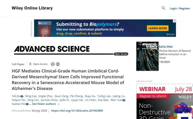 2020年7月6日,國際學(xué)術(shù)期刊《Advanced Science》在線發(fā)表了軍事科學(xué)院軍事醫(yī)學(xué)研究所和華南干細胞與再生醫(yī)學(xué)研究中心的最新研究成果“HGF介導(dǎo)臨床級人臍帶間充質(zhì)干細胞改善功能恢復(fù)在衰老加速的阿爾茨海默氏病小鼠模型中”。