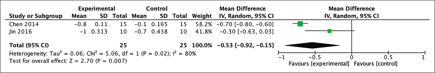 干細胞治療組的平均差異在統計學上更大,盡管這一結果沒有統計學意義(MD = -0.27;95% CI -0.52–0.17;P = 0.33;I 2 = 93%)。