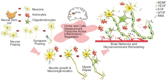 受損的突觸再生涉及兩個主要的生理階段:早期突觸修剪和突觸重新布線。Schuldiner和Yaron回顧了神經突修剪的詳細機制。神經突生長是在移植神經元中建立神經網絡的重要步驟。在小鼠模型中,神經干細胞釋放的血管內皮生長因子 (VEGF) 和血小板反應蛋白1和2可改善新生兒軸突轉運功能。軸突的持續生長需要良好的營養和代謝物運輸能力。在轉運的物質中,各種營養因子和趨化因子協同促進神經干細胞的神經發生。
