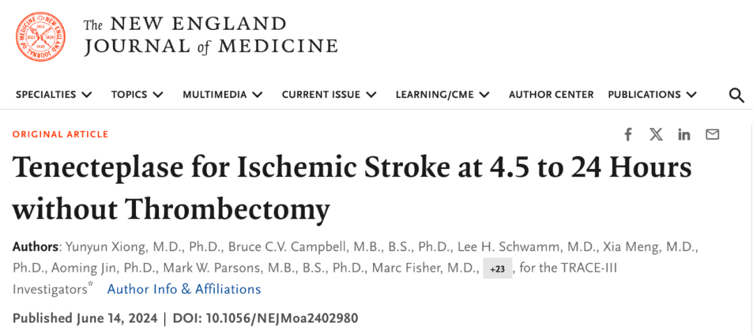 這一突破性更新基于首都醫(yī)科大學(xué)附屬北京天壇醫(yī)院王擁軍教授團(tuán)隊(duì)于2024年6月15日在《NEJM》發(fā)表的重磅研究成果Tenecteplase for lschemic Stroke at4.5 to 24 Hours without Thrombectomy (TRACE-Ⅲ 研究)。[10]