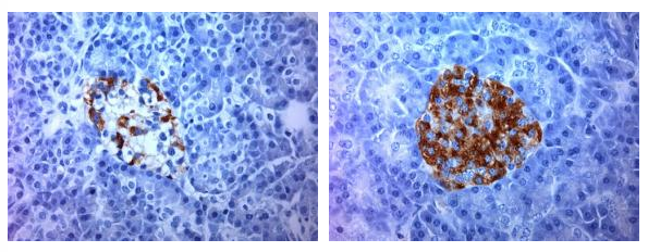 在左圖中,我們可以看到制造的胰島素減少(以棕色顯示)和腫脹,因?yàn)棣录?xì)胞受損。