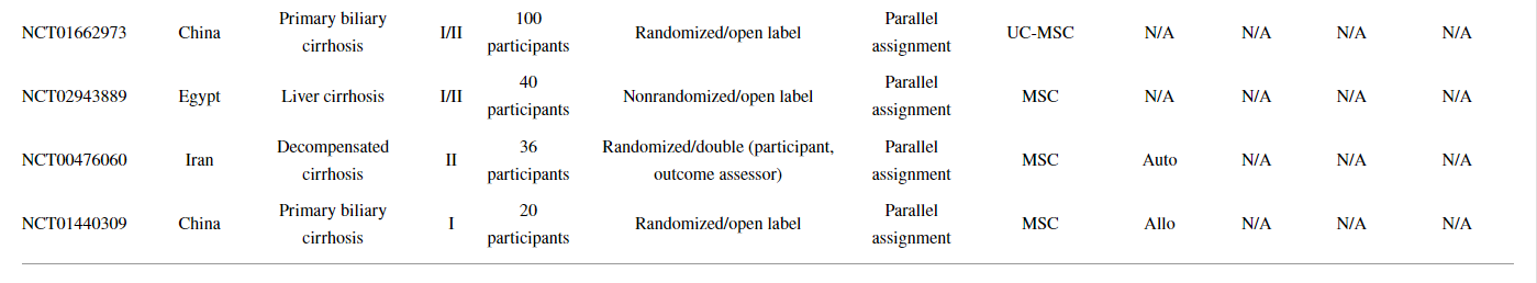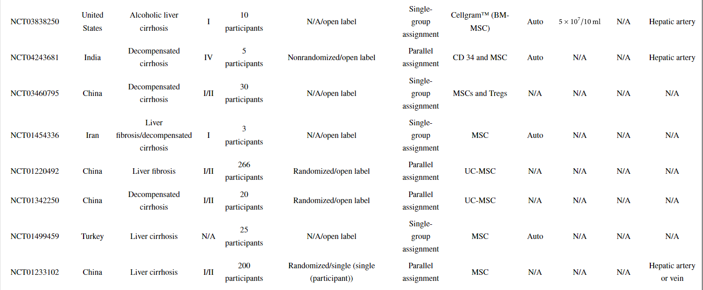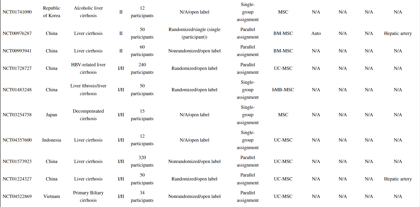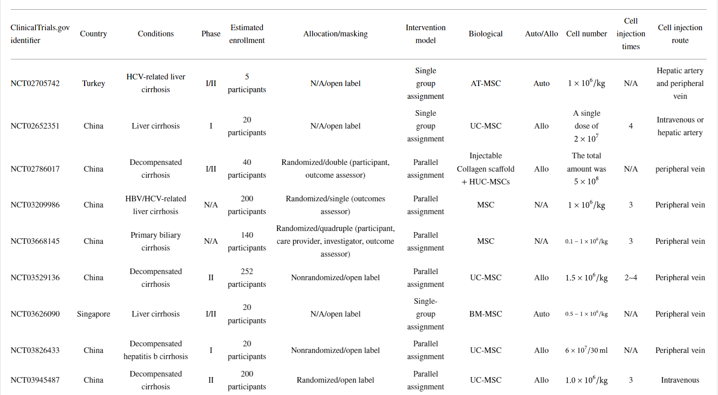 以上顯示了31項已完成或正在進行的MSC治療或MSC聯合細胞治療肝硬化(LC)的臨床試驗。同時,已經發表了許多描述使用MSCs進行臨床試驗結果的報告。