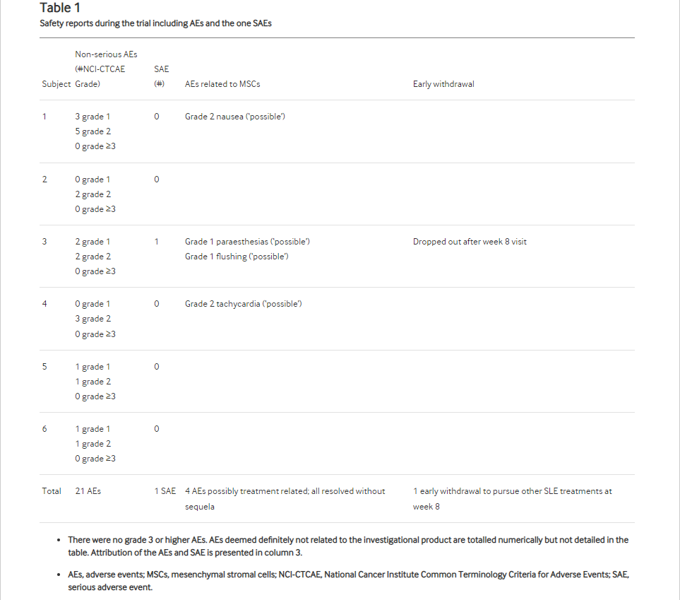 6名SLEDAI>6且標準護理治療失敗的女性接受了一次靜脈輸注1×106MSCs/kg 體重。他們維持目前的免疫抑制劑,但他們的醫生被允許最初調整皮質類固醇以控制癥狀。臨床終點是SRI為4,沒有新的不列顛群島狼瘡活動指南 (BILAG) As,并且在20周內將潑尼松逐漸減量至10mg或更少時,醫生總體評估評分沒有增加>0.3。