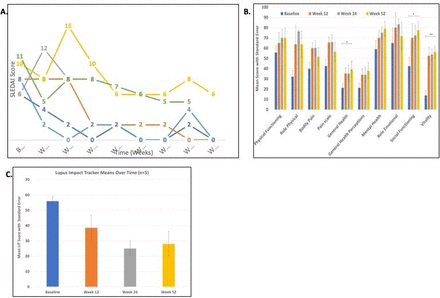 (B) 狼瘡影響追蹤器 (LIT) 是指研究期間的影響。從第12周開始,LIT顯著下降,并持續到第52周 (p=0.007)。誤差線表示SD。代表完成試驗至52周的5名患者的分數。