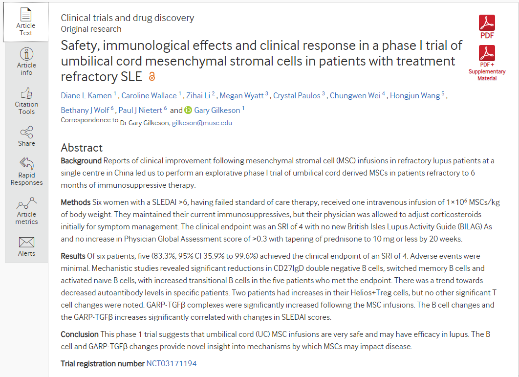 背景:我國南京鼓樓醫院通過干細胞治療難治性狼瘡患者后臨床改善的報告促使我們對經6個月的免疫抑制治療難治的患者進行臍帶來源的MSC的探索性I期試驗。