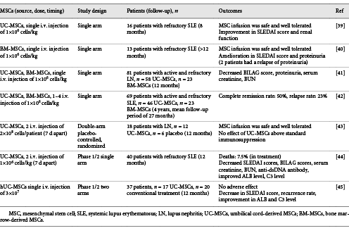 Lazarus等人進(jìn)行了MSC治療的第一個I期試驗(yàn)證明了15名患者志愿者離體培養(yǎng)擴(kuò)增和自體BM-MSC靜脈輸注的安全性。從那時起,間充質(zhì)干細(xì)胞治療免疫性疾病的療法不斷被報道為預(yù)防或治療造血干細(xì)胞移植后移植物抗宿主病的新工具。間充質(zhì)干細(xì)胞移植治療狼瘡性腎炎患者的臨床試驗(yàn)中進(jìn)行了測試(表1)。
