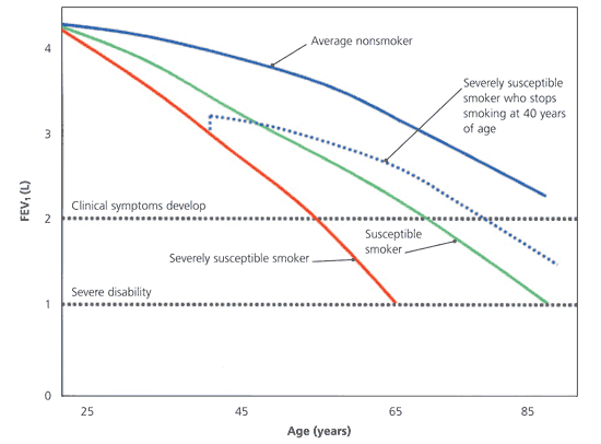 25歲以后,不吸煙的成年人的一秒用力呼氣量 (FEV1) 平均每年減少20至40毫升。在一些吸煙者中,FEV1降低了這個數量的兩到五倍,使他們特別容易患上慢性阻塞性肺病。戒煙可能會導致FEV1略有初始改善(第一年約為50mL)。更重要的是,戒煙可以使曾經吸煙的人與從不吸煙的人一樣平均持續喪失肺功能。圖1說明了肺功能在各種情況下的逐漸喪失。