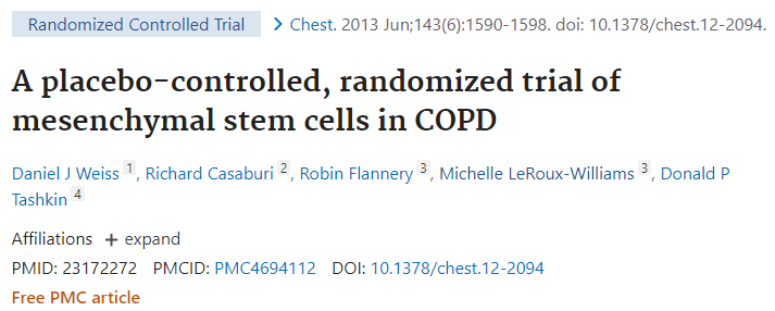1、2013年,美國UCLA的研究小組發表了他們利用異基因來源的間充質干細胞(即Osiris公司的Prochymal產品)治療慢性肺阻的結果(NCT00683722)。