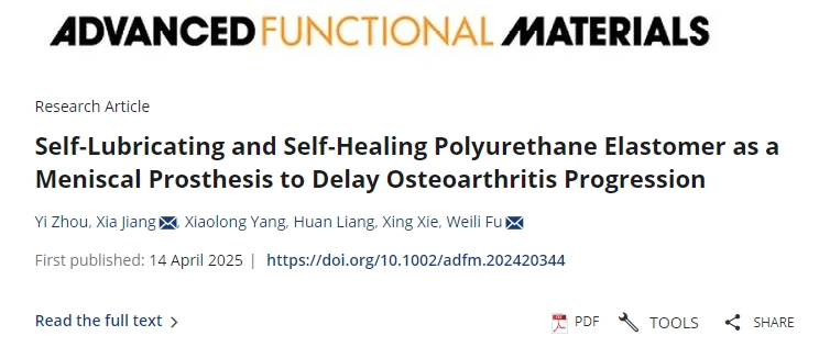 [5]Y. Zhou, X. Jiang, X. Yang, H. Liang, X. Xie, W. Fu, Self-Lubricating and Self-Healing Polyurethane Elastomer as a Meniscal Prosthesis to Delay Osteoarthritis Progression. Adv. Funct. Mater. 2025, 2420344. https://doi.org/10.1002/adfm.202420344