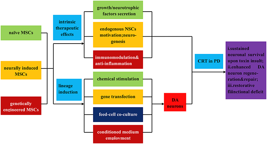 整個過程分為以下三個步驟: (1) 從胚泡內塊分離胚胎干細胞;(2) 通過 (i) 應用形態發生素或可溶性生長因子誘導ESC分化為DA神經元;(ii) 飼養細胞共培養;(iii) 遺傳操作;(iv) 底板譜系誘導策略;(3) 通過功能整合和內源性NPCs動機在PD治療中移植誘導的DA神經元。