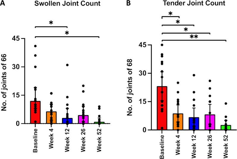 腫脹和壓痛關(guān)節(jié)評(píng)分(根據(jù)ACR66/68關(guān)節(jié)評(píng)估測(cè)量)在隨訪結(jié)束時(shí)顯示與基線相比在第52周有顯著改善,中位數(shù)從12.0 (IQR 8.0–19.0) 下降到1 (IQR 0.0) –3.0) 用于腫脹關(guān)節(jié),20.0 (IQR11.0–36.0) 至1.0 (IQR0.0–4.0) 用于觸痛關(guān)節(jié)計(jì)數(shù)。療效數(shù)據(jù)分析表明,關(guān)節(jié)計(jì)數(shù)的改善具有統(tǒng)計(jì)學(xué)意義(p=0.003和p=0.0008),并且分別對(duì)腫脹和壓痛關(guān)節(jié)計(jì)數(shù)具有較大的影響(ES = 0.83 和 ES = 0.93);圖2, 表2)。