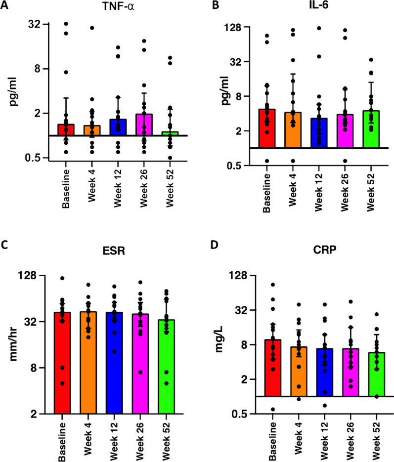 從基線到第52周,IL-6和TNF-α水平?jīng)]有顯著變化,然而,在第4周時(shí)觀察到CRP水平的差異且效應(yīng)量較小 ( p=0.229,ES=0.33),并在第52周時(shí)進(jìn)一步改善 ( p=0.183,ES=0.37)。詳情見(jiàn)圖3d。