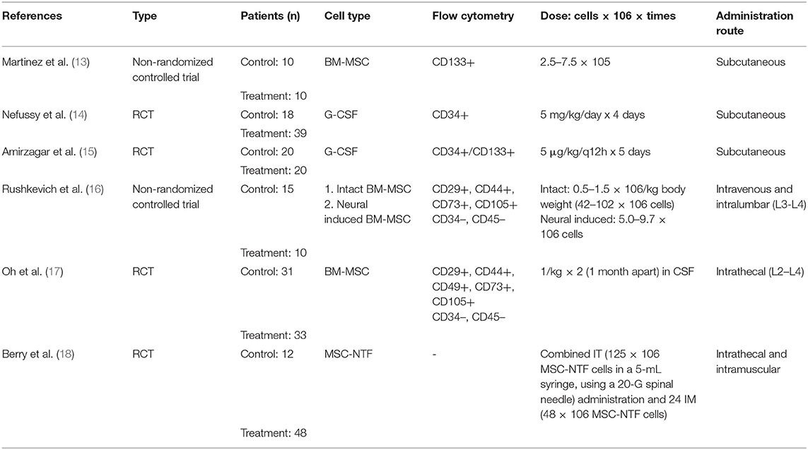 納入的研究使用了以下給藥途徑:皮下、鞘內(nèi)和肌內(nèi)聯(lián)合給藥、靜脈注射后腰椎注射和鞘內(nèi)給藥。在六項(xiàng)研究中,三項(xiàng)使用粒細(xì)胞集落刺激因子 (G-CSF) ,其余使用骨髓間充質(zhì)干細(xì)胞 (BM-MSC) 。