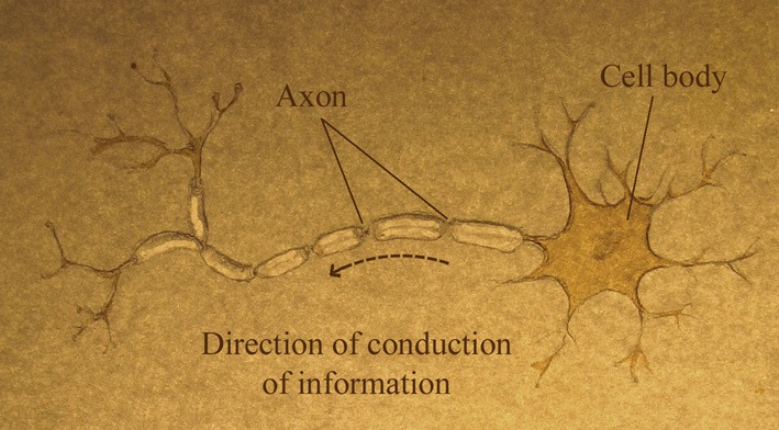 脊髓中發現的主要細胞類型,即神經元,以電信號的形式在脊髓上下傳遞信息。軸突(也稱為神經纖維)是神經元的細長投射物,可將這些信號從神經元細胞體傳導出去。每個神經元只有一個軸突,它可以和整個脊髓一樣長,在成年人身上可達45厘米。