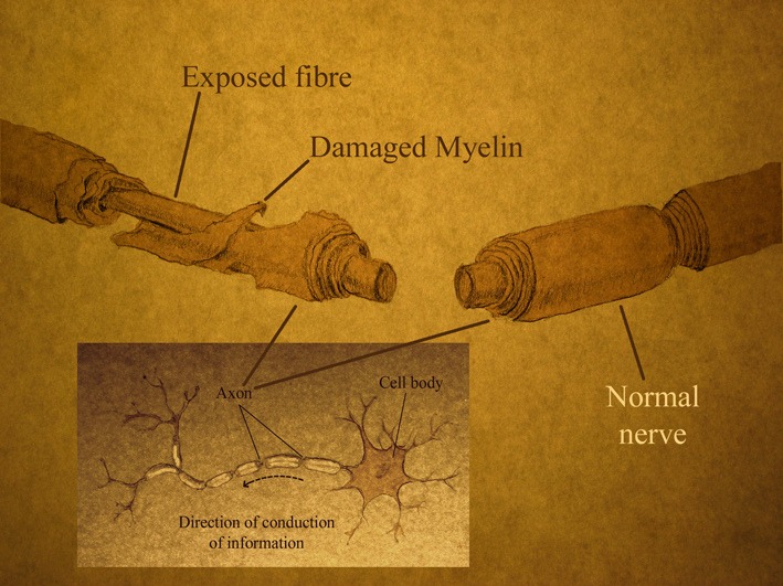 在細胞水平上,軸突被壓碎和撕裂,少突膠質細胞(構成軸突周圍絕緣髓鞘的細胞)開始死亡。暴露的軸突開始退化,這會破壞神經元連接和信息沿脊髓的流動。
