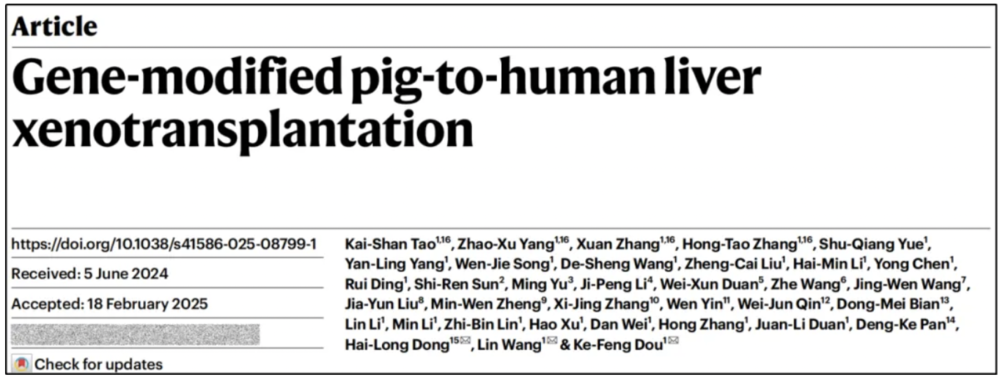 2025年1月7日,空軍軍醫(yī)大學(xué)西京醫(yī)院竇科峰院士團隊完成全球首例“原位豬全肝”人體移植:將一只經(jīng)過基因編輯的豬肝,原位植入一名腦死亡患者體內(nèi)。手術(shù)恢復(fù)血流后,豬肝迅速開始分泌膽汁,并承擔(dān)起正常肝臟的生理功能,驗證了其在人體內(nèi)工作的可行性。[1]