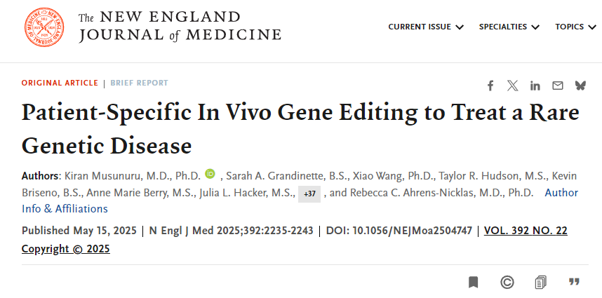 2025年2月25日,全球首個為個體定制的體內(nèi)堿基編輯療法成功應(yīng)用于臨床,挽救了一名6個月大男嬰的生命。這項發(fā)表于《新英格蘭醫(yī)學(xué)雜志》的案例,為罕見遺傳病的精準(zhǔn)治療開辟了新路徑。[3]
