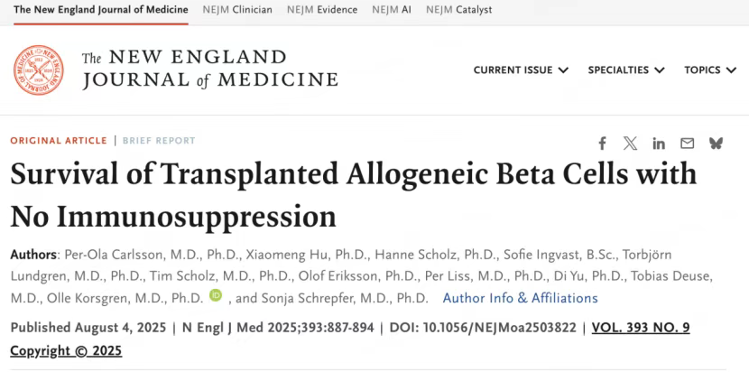 2025年8月4日,瑞典烏普薩拉大學(xué)等機構(gòu)研究人員在《新英格蘭醫(yī)學(xué)雜志》(NEJM)發(fā)表重磅研究,全球首次通過基因編輯改造的異體胰島β細(xì)胞,在不使用免疫抑制劑的情況下,成功治療了一名病史長達37年的1型糖尿病患者。[6]