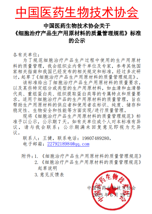 吉林中科生物工程股份有限公司參與制定:《細胞治療產品生產用原材料的質量管理規范》
