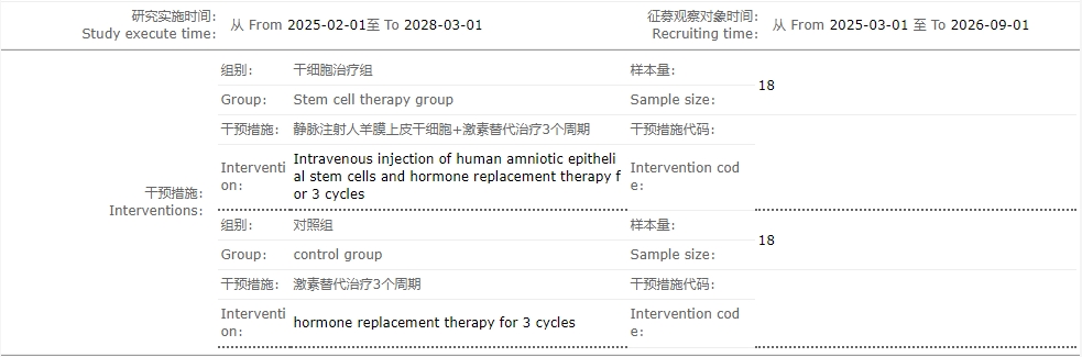 臨床試驗(yàn)二:人羊膜上皮干細(xì)胞移植治療早發(fā)性卵巢功能不全的安全性和有效性:一項(xiàng)單中心、開放、隨機(jī)對照試驗(yàn)(浙江大學(xué)醫(yī)學(xué)院附屬婦產(chǎn)科醫(yī)院)