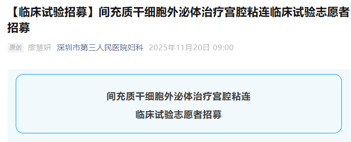 11月20日,深圳市第三人民醫院啟動了一項”間充質干細胞外泌體治療宮腔粘連臨床試驗志愿者招募“的研究。[7]